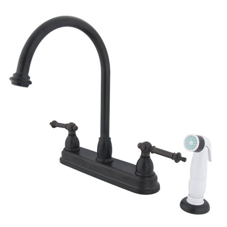 Kingston Brass KB3755TL Tremont Deck Mount 8" Center Kitchen Faucet, Oil Rubbed BronzeTwo Handle Deck Mount, 4 hole Sink application, 8" Centerset, Non-Matellic (ABS) Side Spray, Fabricated from solid brass material for durability and reliability, Premium color finish resist tarnishing and corrosion, 360 degree turn swival spout, 1/4 turn On/Off water control mechanism, 1/2" - 14 NPS male threaded inlets, Duraseal washerless valve, 2.2 GPM (8.3 LPM) Max at 60 PSI, Integrated removable aerator, 8-1/2" spout reach from faucet body, 12-1/4" overall height, Ten Year Limited Warranty to the original consumer to be free from defects in material and finish.Kingston Brass KB3755TL Tremont Deck Mount 8" Center Kitchen Faucet, Oil Rubbed Bronze Features:; Plastic Sprayer Included; Oil Rubbed Bronze Finish; 2 GPM (7.5 LPM) Max @ 60 PSI; Kingston Brass KB3755TL Kitchen Faucet with Side Sprayer Oil Rubbed Bronze ; 1/4 Turn Washerless Cartridge; Tampleton Lever Handle; 8" Center