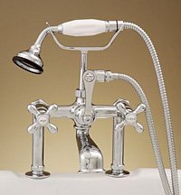 Deck Mounted English Telephone Clawfoot Tub Faucet by Strom Plumbing. Porcelain shower handle and metal cross handles with Hot and Cold lettered porcelain inserts. Modern ceramic quarter-turn valves for smooth drip-free operation. Solid brass construction. Available in chrome supercoated brass polished nickel oil rubbed bronze and matte nickel. Fits tubs with 7 Inches rim drillings. 60 Inches long shower hose. 5 Inches spout length. 8.1 gal/min. flow rate at 60 PSI. 6 Inches Risers. P0462S.
