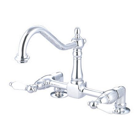 Kingston Brass KS1141PL Heritage Deck Mount Kitchen Faucet with 2" Riser, 8" Spread, ChromeTwo Handle Deck Mount, 2 hole Sink application, 8" Centerset, Fabricated from solid brass material for durability and reliability, Premium color finish resist tarnishing and corrosion, 360 degree turn swival spout, 1/4 turn On/Off water control mechanism, 1/2" - 14 NPS male threaded inlets, Ceramic disc valve, 2.2 GPM (8.3 LPM) Max at 60 PSI, Integrated removable aerator, 8-3/4" spout reach from faucet body, 9-1/2" overall height, Ten Year Limited Warranty to the original consumer to be free from defects in material and finish.Kingston Brass KS1141PL Heritage Deck Mount Kitchen Faucet with 2" Riser, 8" Spread, Chrome Features:; Brass Construction; Chrome Finish; 2 GPM (7.5 LPM) Max @ 60 PSI; 1/4 Turn Ceramic Disk Cartridge; Porcelain Lever Handle; 8" Center with 2" Riser; 9" Spout Reach