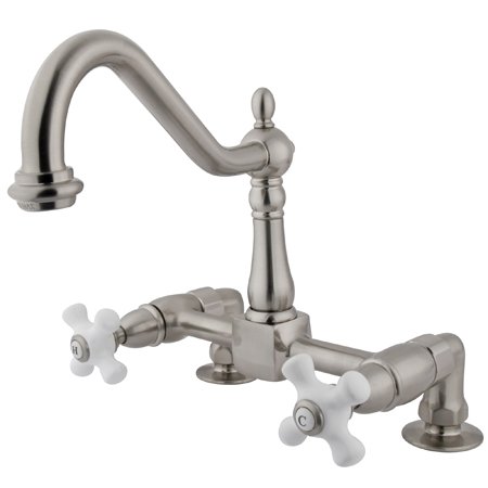 Kingston Brass KS1145PX Heritage Deck Mount Kitchen Faucet with 2" Riser, 8" Spread, Oil Rubbed BronzeTwo Handle Deck Mount, 2 hole Sink application, 8" Centerset, Fabricated from solid brass material for durability and reliability, Premium color finish resist tarnishing and corrosion, 360 degree turn swival spout, 1/4 turn On/Off water control mechanism, 1/2" - 14 NPS male threaded inlets, Ceramic disc valve, 2.2 GPM (8.3 LPM) Max at 60 PSI, Integrated removable aerator, 8-3/4" spout reach from faucet body, 9-1/2" overall height, Ten Year Limited Warranty to the original consumer to be free from defects in material and finish.Kingston Brass KS1145PX Heritage Deck Mount Kitchen Faucet with 2" Riser, 8" Spread, Oil Rubbed Bronze Features:; Brass Construction; Oil Rubbed Bronze Finish; 2 GPM (7.5 LPM) Max @ 60 PSI; 1/4 Turn Ceramic Disk Cartridge; Porcelain Cross Handle; 8" Center with 2" Riser; 9" Spout Reach* Image shown may vary by color, finish, or material