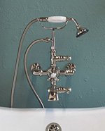 Strom Plumbing thermostatic clawfoot tub faucet with low spout and handshower. Bathroom wall mount installation. Features 7- inch centers. Available in chrome, matte nickel, polished nickel, supercoated brass, and oil rubbed bronze.